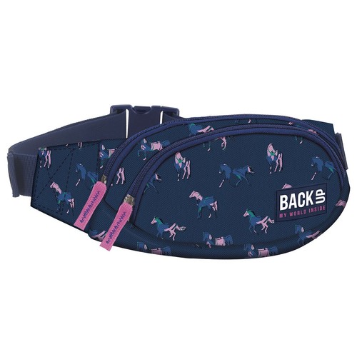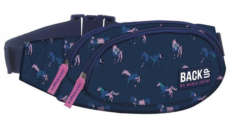 Torba na biodra BackUP model A 17 gdzie intensywne, granatowe tło ozdobione zostało motywami różowo-niebieskich koni, które pokochają nastolatki. Wyposażenie: - 2 kieszenie na zamek z przodu - 1 bezpieczna kieszeń z tyłu, - duża klamra i szeroki pasek z estetycznymi gumkami, ułatwiającymi użytkowanie. Nerka pomieści nawet duże telefony a niewypełnioną łatwo ukryć pod ubraniem. Oryginalny krój pozwala na praktyczne użytkowanie. Wymiar: 25 x 12 x 6 cm