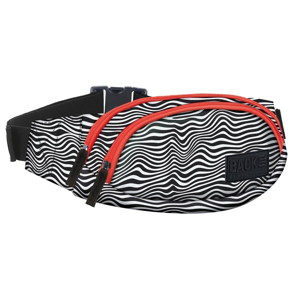 Torba na biodra BackUP model A 35 w motyw zebry, a w zasadzie stado zebr. Sylwetki tych przyjaznych zwierzaków zostały połączone w świetny wzór tworzący biało-czarne pasy. Podstawowe kolory: biel i czerń, zawsze w dobrym guście, akcentuje czerwony zamek. Wyposażenie: - 2 kieszenie na zamek z przodu - 1 bezpieczna kieszeń z tyłu, - duża klamra i szeroki pasek z estetycznymi gumkami, ułatwiającymi użytkowanie. Nerka pomieści nawet duże telefony a niewypełnioną łatwo ukryć pod ubraniem. Oryginalny krój pozwala na praktyczne użytkowanie. Wymiar: 25 x 12 x 6cm.