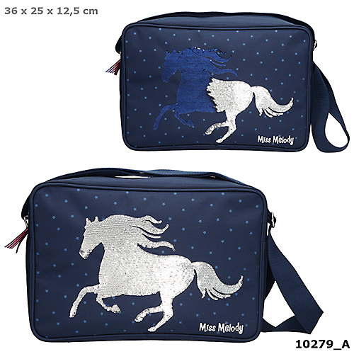 Torba w odcieniach granatu z wizerunkiem cekinowego konia prezentuje się naprawdę uroczo. Cekiny pod naciskiem palca zmieniają swój kolor ze srebrnego na granatowy.