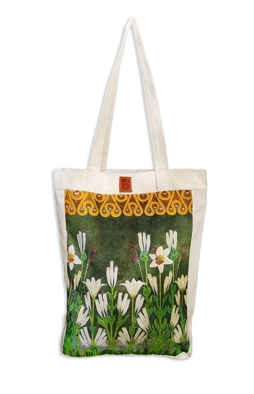 Torba - typu shopper - z tyłem i bokami w kolorze ecru zadrukowana oryginalną, niepowtarzalną grafiką w pięknych barwach, przedstawiającą fragment polichromii autorstwa Stanisława Wyspiańskiego, znajdującej się w bazylice Franciszkanów w Krakowie.