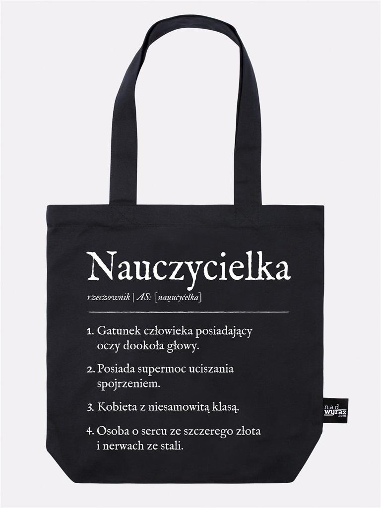 Nauczycielka: Gatunek człowieka posiadający oczy dookoła głowy. Posiada supermoc uciszania spojrzeniem. Kobieta z niesamowitą klasą. Osoba o sercu ze szczerego złota i nerwach ze stali. Torba z nadrukiem NAUCZYCIELKA to idealny pomysł na prezent dla nauczycielki z okazji Dnia Nauczyciela. Idealnie sprawdzi się także jako prezent dla wychowawczyni. Torba bawełniana NAUCZYCIELKA powstała od A do Ż w Polsce z myślą o naszych ulubionych belfrach oraz wszystkich tych, którzy w pocie czoła niosą kaganek oświaty. Prezent dla nauczycielki jak znalazł! Gramatura 280 g/m Nadruk wykonany metodą sitodruku (wysokiej jakości oraz bardzo trwały) 100% bawełna, torba ekologiczna Torba na prezent dla wychowawczyni W środku torby pojemna kieszonka na akcesoria Elegancka metka boczna Wymiary: 40,5 x 41 x 8,5 cm, ucho: 63 x 3,5 cm (wymiary mogą się różnić do 1,5 cm) Prać w niskiej temperaturze, prasować na lewej stronie, nie czyścić chemicznie