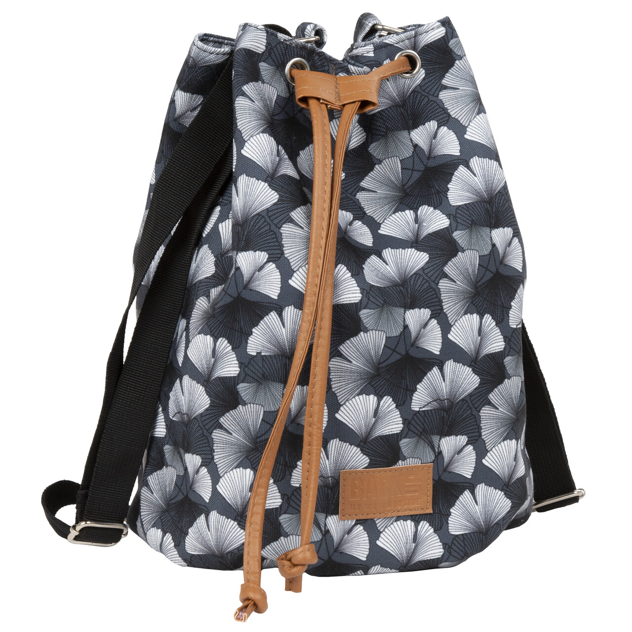 "Torba 2 w 1 plecaczek i torebka na ramię. Dzięki regulowanemu, szerokiemu paskowi można ją nosić wygodnie na ramieniu, a dodatkowo dzięki napie z tyłu pasek można spiąć i uzyskać niezwykle poręczny plecaczek. Monochromatyczny wzór w liście miłorzębu jest jednocześnie oryginalny i elegancki.