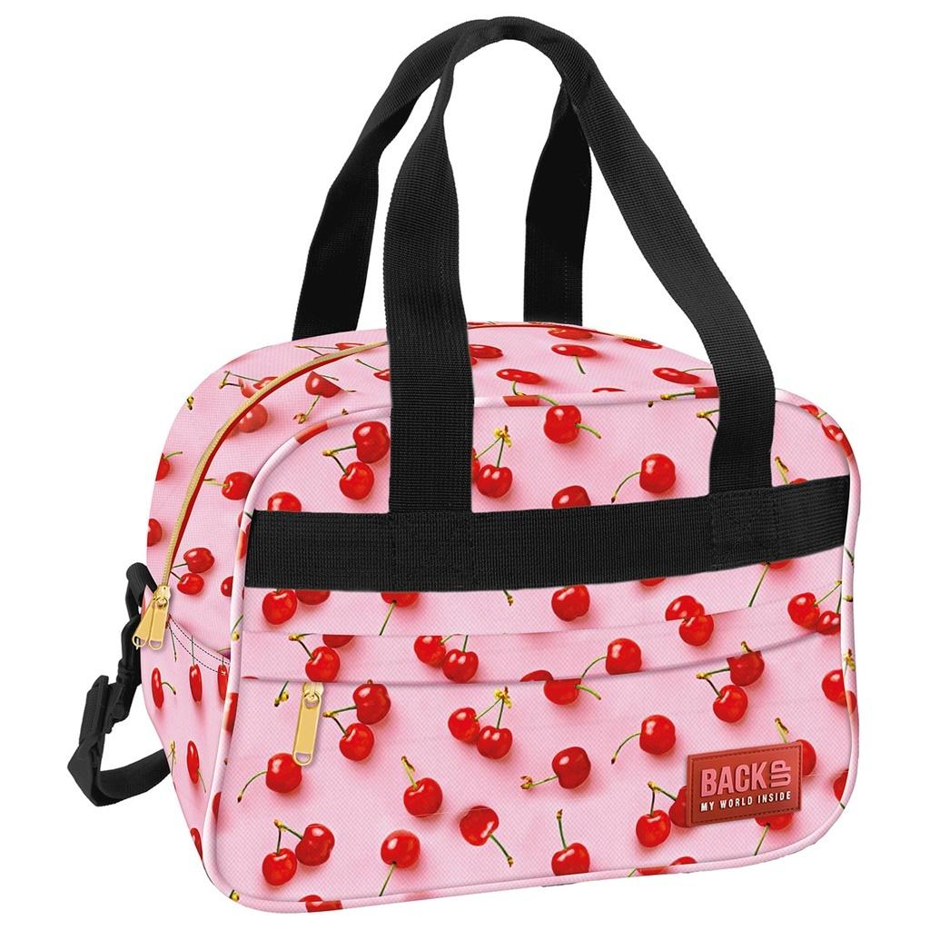 Torba podróżna BackUP model A 31 w najpyszniejszy wzór w ulubionym kolorze różu w odcieniu malinowego kremu z motywem przesłodkich wisienek.