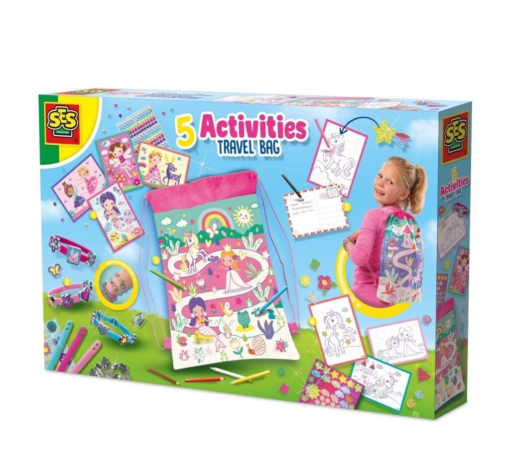 Wyrusz w pełną zabawy podróż z torbą podróżną 5 Activities! Ta kolorowa torba jest wypełniona aktywnościami, które zapewnią Ci rozrywkę w podróży, w tym spersonalizowaną kolorową torbę podróżną. Idealna na wycieczki lub wizyty u znajomych, pozwala Ci kolorować, tworzyć i bawić się wszędzie. Zestaw zawiera torbę do kolorowania, naklejki, samoprzylepne diamenty, 8 ołówków, zawieszki do bransoletek, 3 bransoletki, pocztówki i karty do malowania diamentami. Te aktywności rozwijają umiejętności motoryczne i kreatywność, sprawiając, że podróżowanie staje się przyjemne. Zdobądź swoją torbę podróżną 5 Activities już dziś, aby przeżyć niekończące się przygody i zabawę!