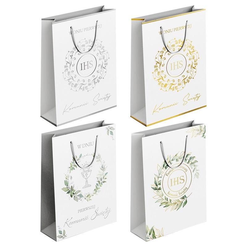 Torby prezentowe bogato ozdobione srebrną lub złotą folią. Gruby papier o dużej sztywności gramatura 210 g/m. Miks 4 wzorów wysyłany losowo