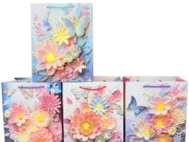 Odkryj nasz wyjątkowy zestaw 12 toreb prezentowych 3D, które zachwycą każdego obdarowanego. Każda torba to małe dzieło sztuki, ozdobione pięknymi, trójwymiarowymi motywami kwiatowymi i delikatnymi motylami. Pastelowe odcienie różu, błękitu i żółci tworzą harmonijną kompozycję, idealną do pakowania prezentów na każdą okazję - od urodzin, przez imieniny, po święta i rocznice. Wypukłe elementy dodają torbom tekstury i sprawiają, że wyróżniają się na tle tradycyjnych opakowań. Zestaw jest sprzedawany jako opakowanie zbiorcze 12 sztuk, jednak cena podana jest za jedną sztukę.