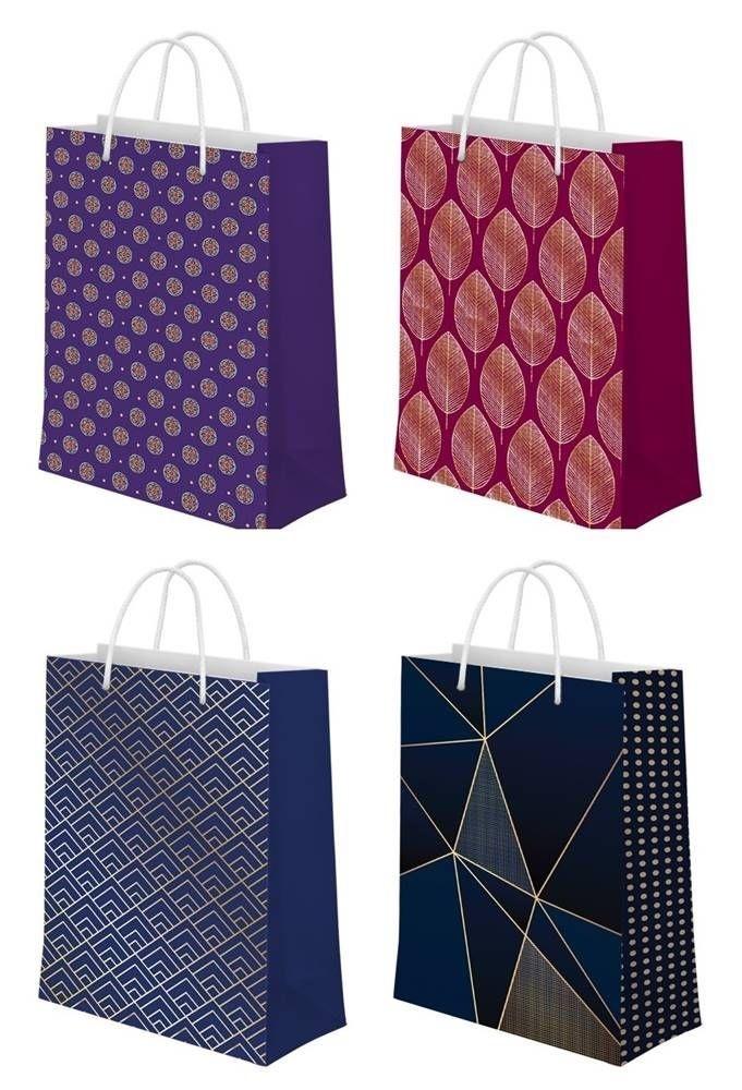 Torby Kukartka z serii Q są wykonane z grubego, satynowego papieru, mają zdobienia ze złotej/srebrnej folii i rączki z atłasowej tasiemki. Są piękne, solidnie wykonane i stanowią idealną oprawę dla każdego prezentu.