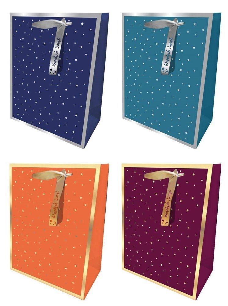Najwyższej jakości torby wykonane z grubego, satynowego papieru, zdobione złotą lub srebrną folią, matowe lub błyszczące (w zależności od wzoru) z uchwyt z atłasowej tasiemki.