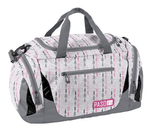Torba sportowa. Idealna na zajęcia sportowe, fitness bądź krótkie wyjazdy. Pojemna komora główna, mala kieszeń na froncie, 2 kieszenie boczne (w tym jedna na obuwie). Dwa uchwyty do przenoszenia, pasek na ramię z osłonką.