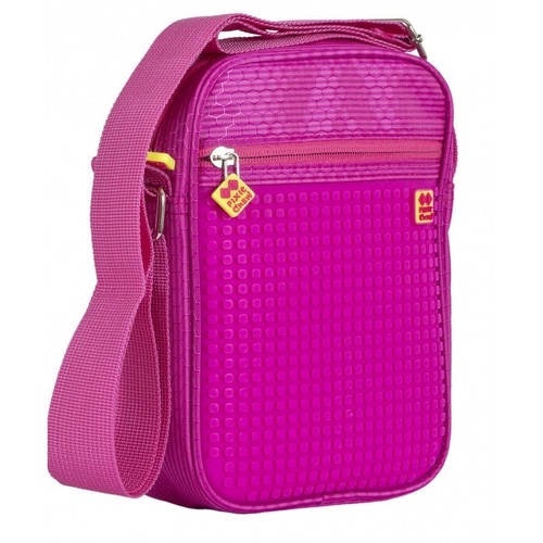 Praktyczna purpurowa torebka na ramię PIXIE CREW, odpowiednia na każdą okazję, jest bardzo funkcjonalna. Z łatwością pomieści wszelkie ""niezbędne"" rzeczy, które chcemy mieć pod ręką (telefon, dokumenty, kosmetyki, klucze). Torebka posiada jedną główną kieszeń z dwiema przegródkami i jedną przednią. Obie zapinane są na zamek błyskawiczny. Wygodne użytkowanie zapewnia również pasek, o regulowanej długości. Na przedniej kieszonce znajduje się kreatywny purpurowy panel, na którym można tworzyć oryginalne, spersonalizowane grafiki, przy pomocy małych silikonowych pikseli. Kreatywny panel PIXIE CREW TM wykonany jest z najwyższej jakości silikonu. Wyposażony jest w niewielkie występy w kształcie litery ""T"", do których możemy mocować małe płytki - piksele oraz multipixele z obrazkami, tworząc własne grafiki lub kopiować gotowe szablony. Torebka jest sprzedawana z darmowym pakietem około 200 kolorowych pikseli.