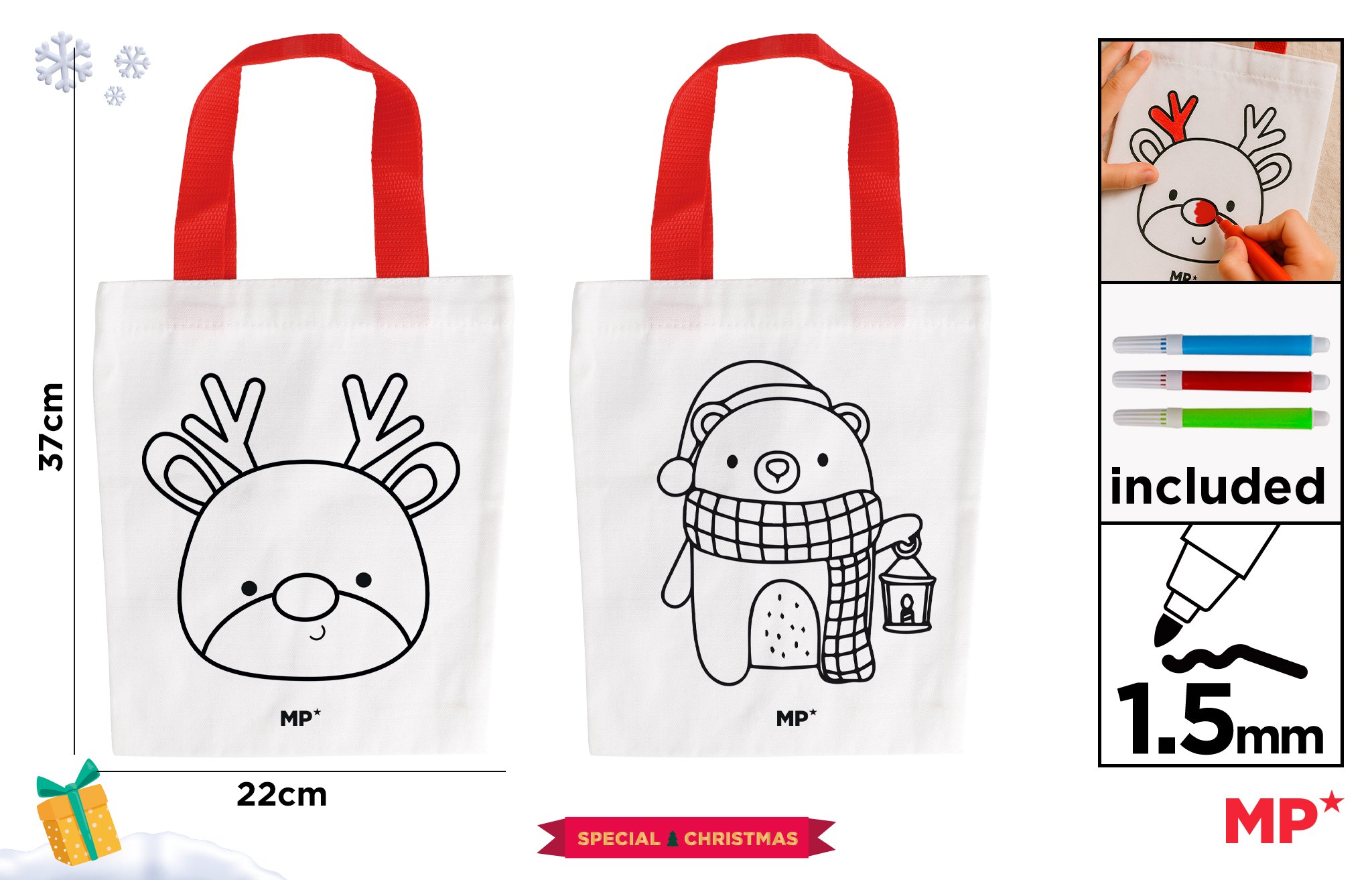 W zestawie 3 flamastry akwarelowe (czerwony, zielony, żółty). 3 markery są umieszczone w torbie z PVC z etykietą przymocowaną do rączki torby. Wzór: renifer / miś.