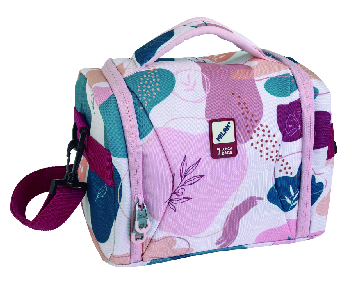Izotermiczna duża torba na żywność z kolekcji SLOW z harmonijnym nadrukiem zachęcającym do wyciszenia i cieszenia się małymi rzeczami. Paleta botanicznych kolorów łączy bladoróżowe tony z akcentami w kolorze szałwii i bordowej jagody.