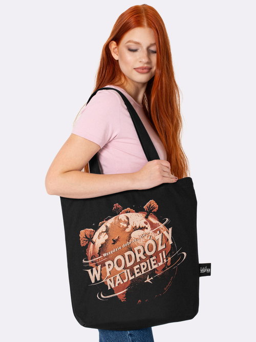 Wszędzie dobrze, ale w podróży najlepiej! Jeśli znasz osobę, która: jest cały czas w drodze, lubi łamać konwenanse, cały świat traktuje jako swój dom, torba bawełniana W PODRÓŻY NAJLEPIEJ została stworzona z myślą o niej! Ta wyjątkowa torba materiałowa z nadrukiem to najlepszy pomysł na prezent dla podróżnika, obieżyświata, włóczykija i rogatej duszy. Podaruj ją największemu włóczędze, jakiego znasz. Prezent urodzinowy dla turysty jak znalazł! Duża torba bawełniana W PODRÓŻY NAJLEPIEJ powstała od A do Ż w Polsce z miłości do małych wycieczek i wielkich wypraw. Sprawdzony prezent dla podróżnika! Gramatura 280 g/m2 Nadruk wykonany metodą sitodruku (wysokiej jakości oraz bardzo trwały) 100% bawełna, torba ekologiczna Torba na prezent dla turysty W środku torby pojemna kieszonka na akcesoria Elegancka metka boczna Wymiary: 40,5 x 41 x 8,5 cm, ucho: 63 x 3,5 cm (wymiary mogą się różnić do 1,5 cm) Prać w niskiej temperaturze, prasować na lewej stronie, nie czyścić chemicznie