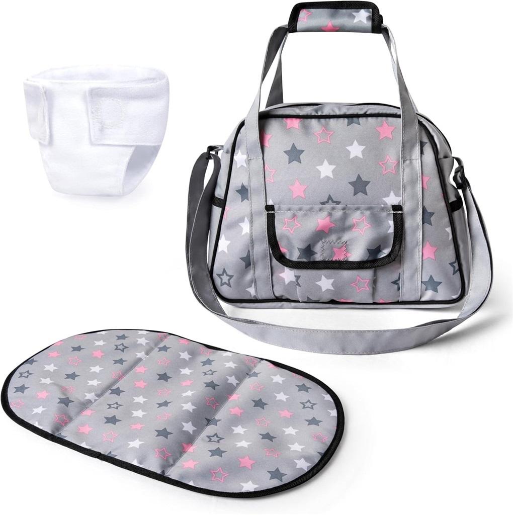 Ta piękna torba na pieluchy zawiera podkładkę do przewijania oraz wszytą pieluchę i jest idealna do przechowywania niezbędnych rzeczy dla lalek przez cały czas. Torba ma nowoczesny design i jest zamykana na zamek, dzięki czemu wszystkie rzeczy mogą być bezpiecznie przechowywane. Dodatkowa przestrzeń zapewnia mała naszywana kieszonka z przodu. W niej np. smoczek lalki może być zawsze w zasięgu ręki. Dzięki regulowanemu paskowi na ramie, torbę na pieluchy można dopasować do wielkości dziecka. Wyścielanie wokół uchwytów torby zapewnia dodatkowy komfort noszenia. W zestawie oprócz torby znajduje się mata do przewijania. Dołączona do zestawu pieluszka do szycia jest łatwa do otwierania i zamykania, nawet dla małych raczek dziecka.