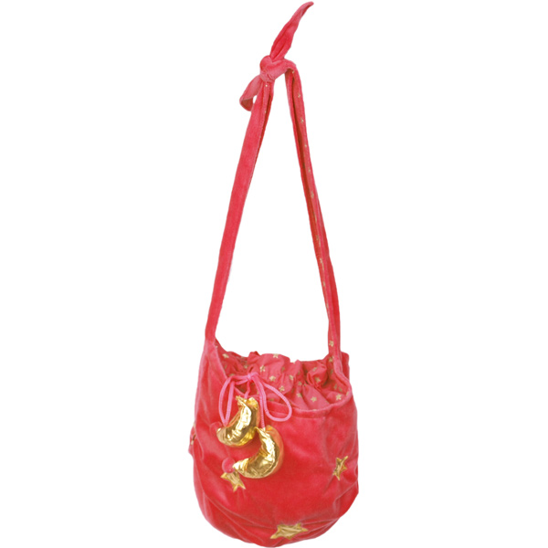 Czerwona torebka na ramię ściągana na troczek.W dolnej części torebki złote gwiazdki na bokach.Wewnątrz podszewka w złote gwiazdki.Materiał 100 % poliester