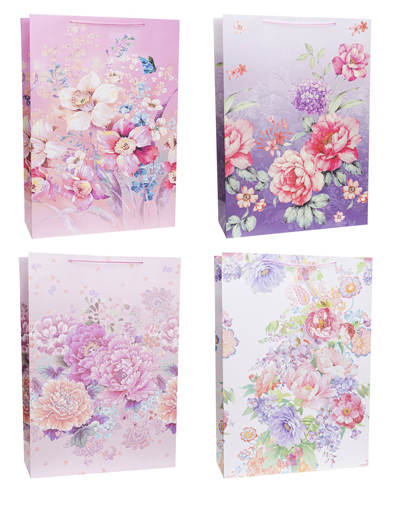 Torebka ozdobna Lux 210 gsm wz. pastelowe kwiaty białe tło Gigant, pakowana po 12 sztuk, mix 4 wzorów (51x72x18)