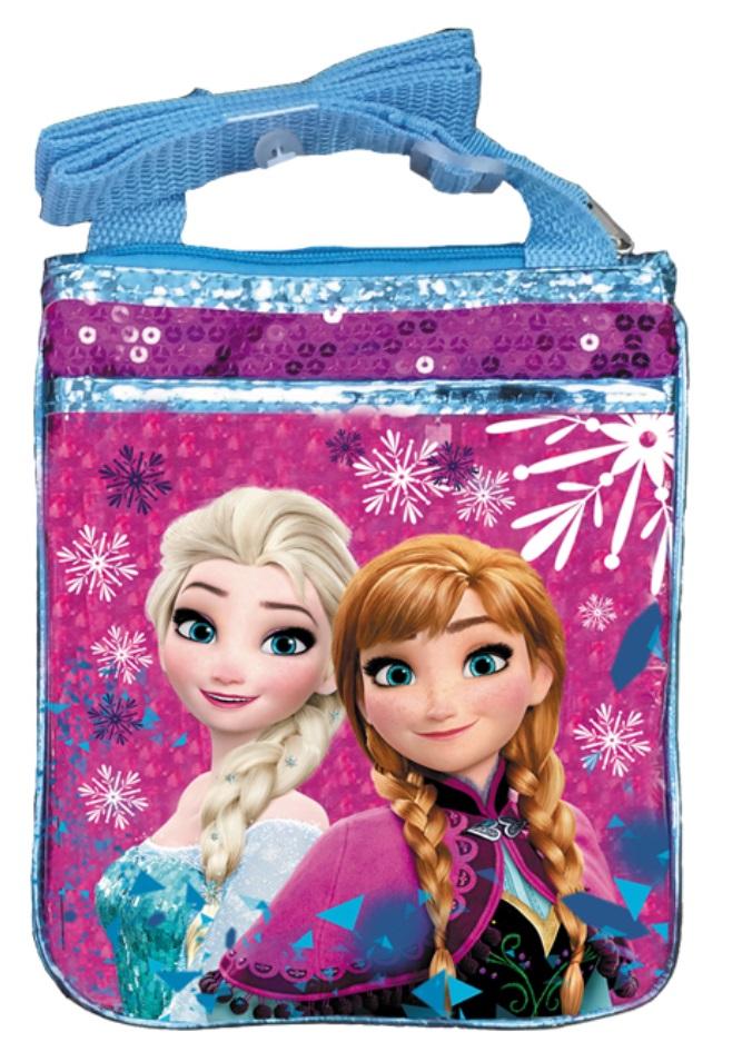 Torebka na ramię pokryta kolorowymi cekinami, które mienią się w blasku słońca. Torebka w formie saszetki jest zamykana na zamek i świetnie chroni wszystkie skarby właścicielki. Całość została pokryta podobiznami ulubionych bohaterów.