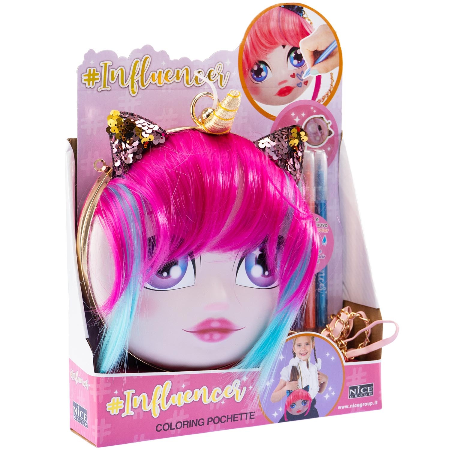 Torebka z paskiem/ łańcuszkiem na ramię. Twarz dziewczynki na froncie, którą można malować, zmyć przy użyciu wody i ponownie pomalować. Włosy można czesać, stylizować. 4 mazaki w zestawie. 4+