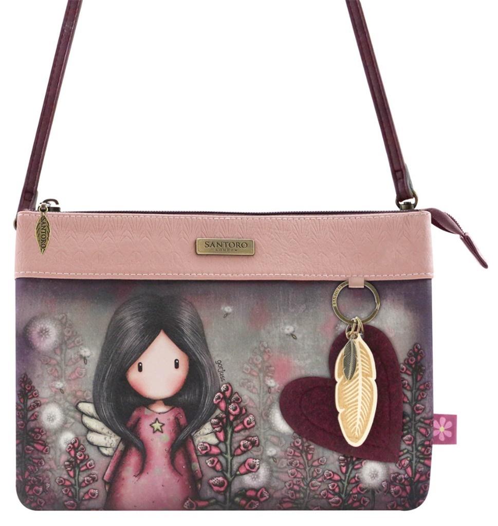 Bardzo poręczna torba z wizerunkiem dziewczynki Gorjuss ze skrzydełkami. Idealna na podróż, na plażę lub spacer. Bardzo elegancka i trwała ozdobiona efektownym liściem z filcu i serduszkiem z logiem Santoro. Przestronne wnętrze ozdobione stylowymi paskami podzielone na trzy przegrody. W środku kieszeń zamykana na suwak z uchwytem na klucze. Dodatkowo przegródka z kieszonką na karty oraz druga z kieszonką na telefon. Torba od góry również zamykana na suwak.