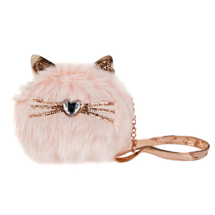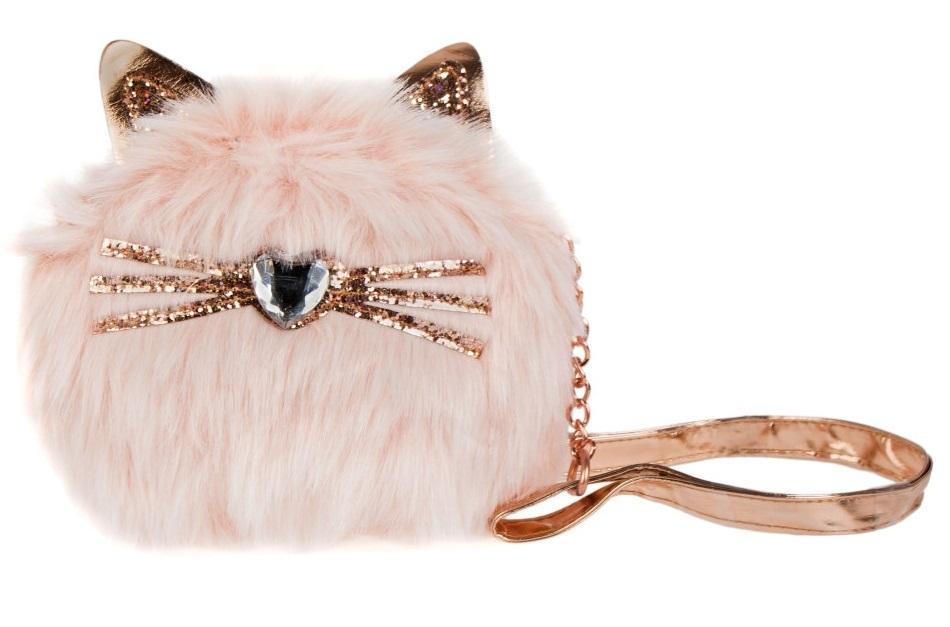 Torebka wykonana z miękkiego, różowego pluszowego materiału w kształcie uroczego kotka.