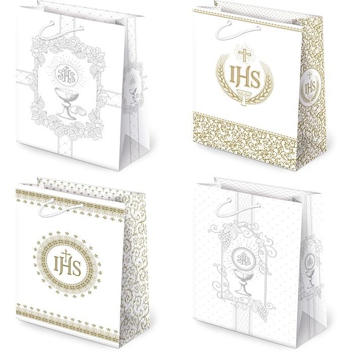 Torebka ozdobna KOMUNIA T-2L średnia, mix wzorów, wzór wysyłany losowo, wymiary po rozłożeniu: 31,5x22,5x10,8cm