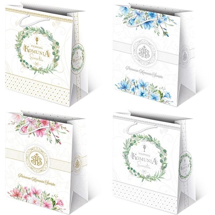 Torebka ozdobna KOMUNIA T-8L mała, mix wzorów, wzór wysyłany losowo, wymiary po rozłożeniu: 20x24x11cm