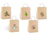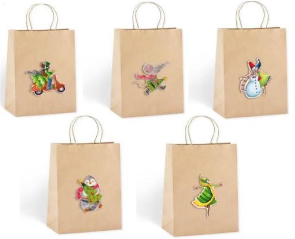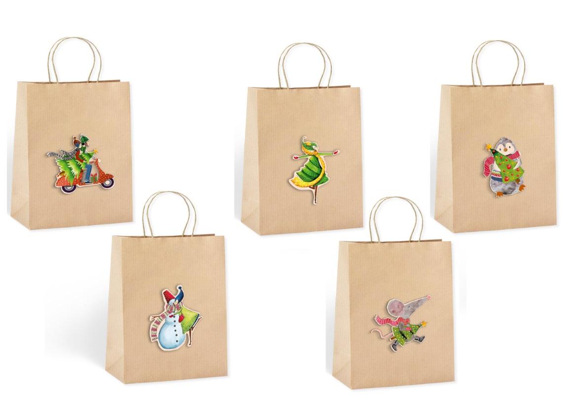 Brązowa torebka na prezent z elementem naklejanym (drewnianą aplikacją). Mix wzorów, wzór wysyłany losowo.