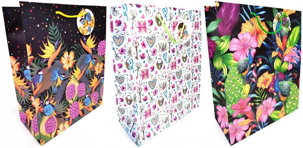 Torebka ozdobna matowa 26x32x12cm, mix wzorów, wzór wysyłany losowo.