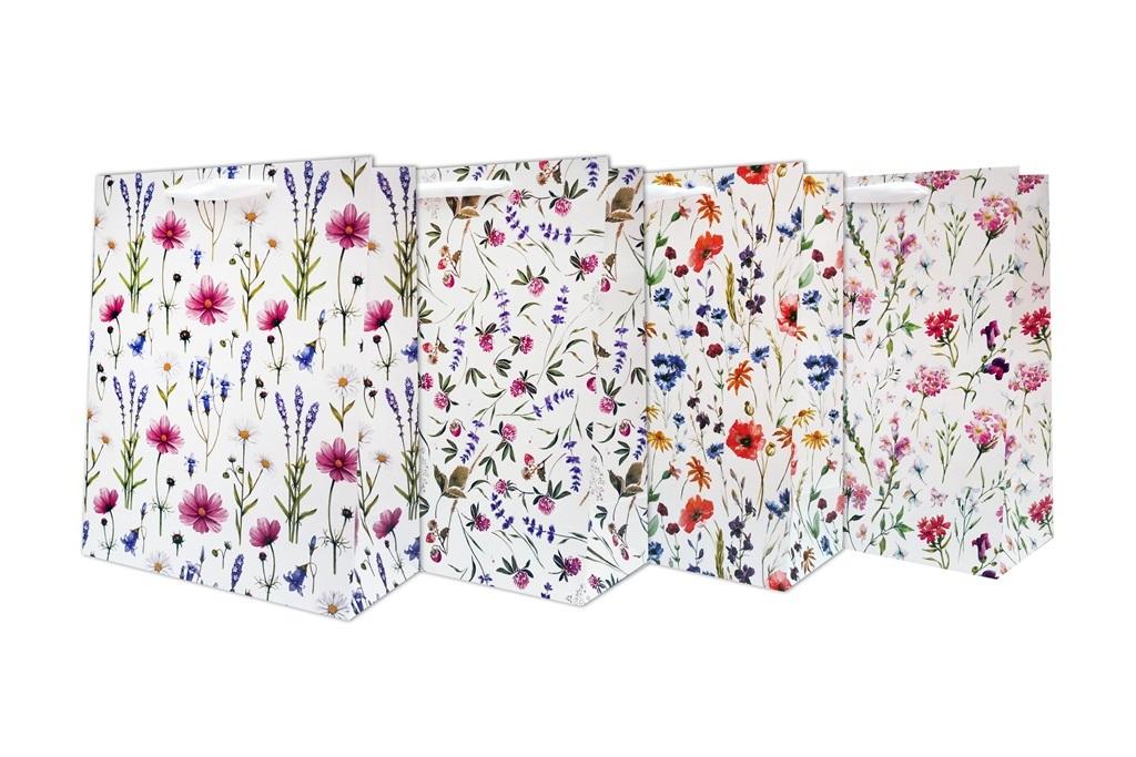 Torebka ozdobna, pionowa, o wymiarach 40,5x31x12 cm. Dostępna w 4 kwiatowych wzorach, na białym tle. Zamiast sznurka znajduje się ozdobna wstążeczka. Posiada wzmacniany spód.