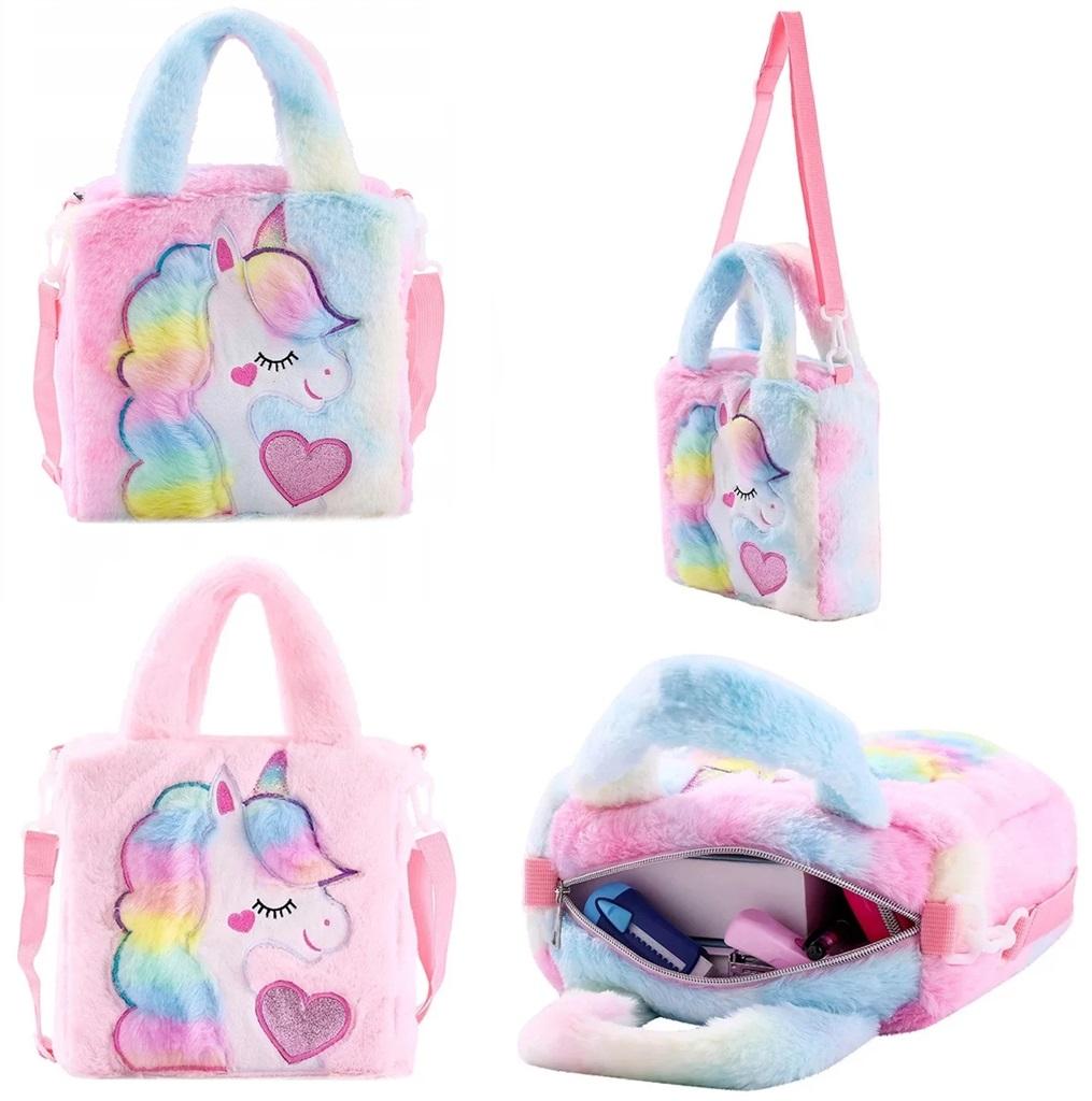 Torebka jednorożec zapinana na zamek. Wykonana z pluszowego materiału w pastelowych kolorach.