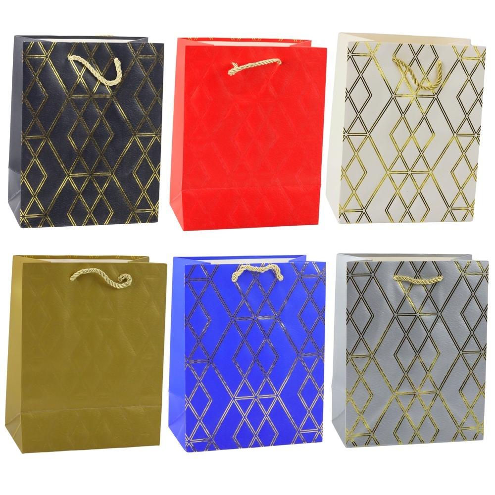 Stylowa torba prezentowa z geometrycznym wzorem w postaci złotych, błyszczących linii to doskonały wybór na każdą uroczystą okazję. Jej minimalistyczny, a jednocześnie luksusowy design nadaje podarunkowi prestiżowego wyglądu, podkreślając wyjątkowość prezentu.