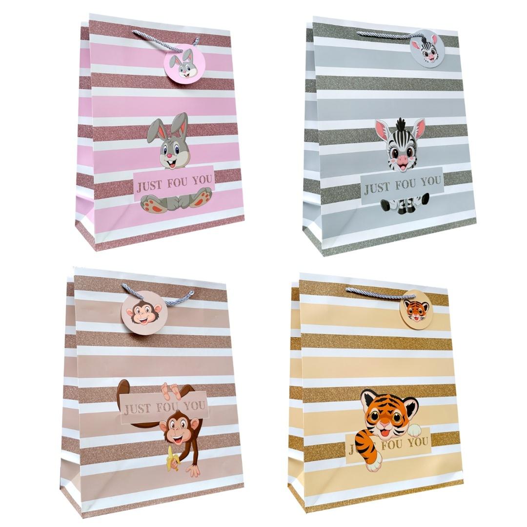 Torebka papierowa dziecięca wykonana z grubszego papieru o gramaturze 210 g, co zapewnia jej większą trwałość i odporność na obciążenie. Wyposażona w grubszy, kolorowy sznurek, który zapewnia wygodny uchwyt i estetyczne wykończenie. To praktyczne opakowanie, które podkreśla wartość wręczanego prezentu.