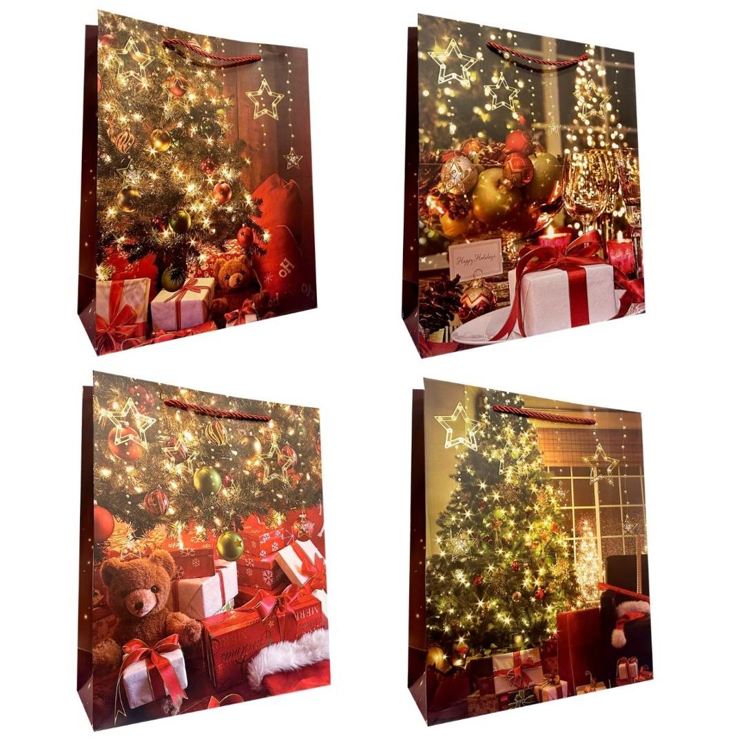 Świąteczna torebka prezentowa wykonana z trwałego papieru, utrzymana w klasycznej, eleganckiej stylistyce. Idealna do zapakowania prezentów pod choinkę, nadaje upominkom wyjątkowy, odświętny charakter. Wyposażona w mocne uchwyty i staranne wykończenie, łączy estetykę z praktycznością.