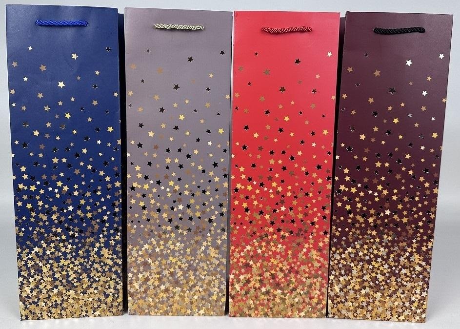 Torebka prezentowa na butelkę Premium. Materiał karton 210 gr. Złocone elementy ozdobne. Uchwyt ze sznurka.