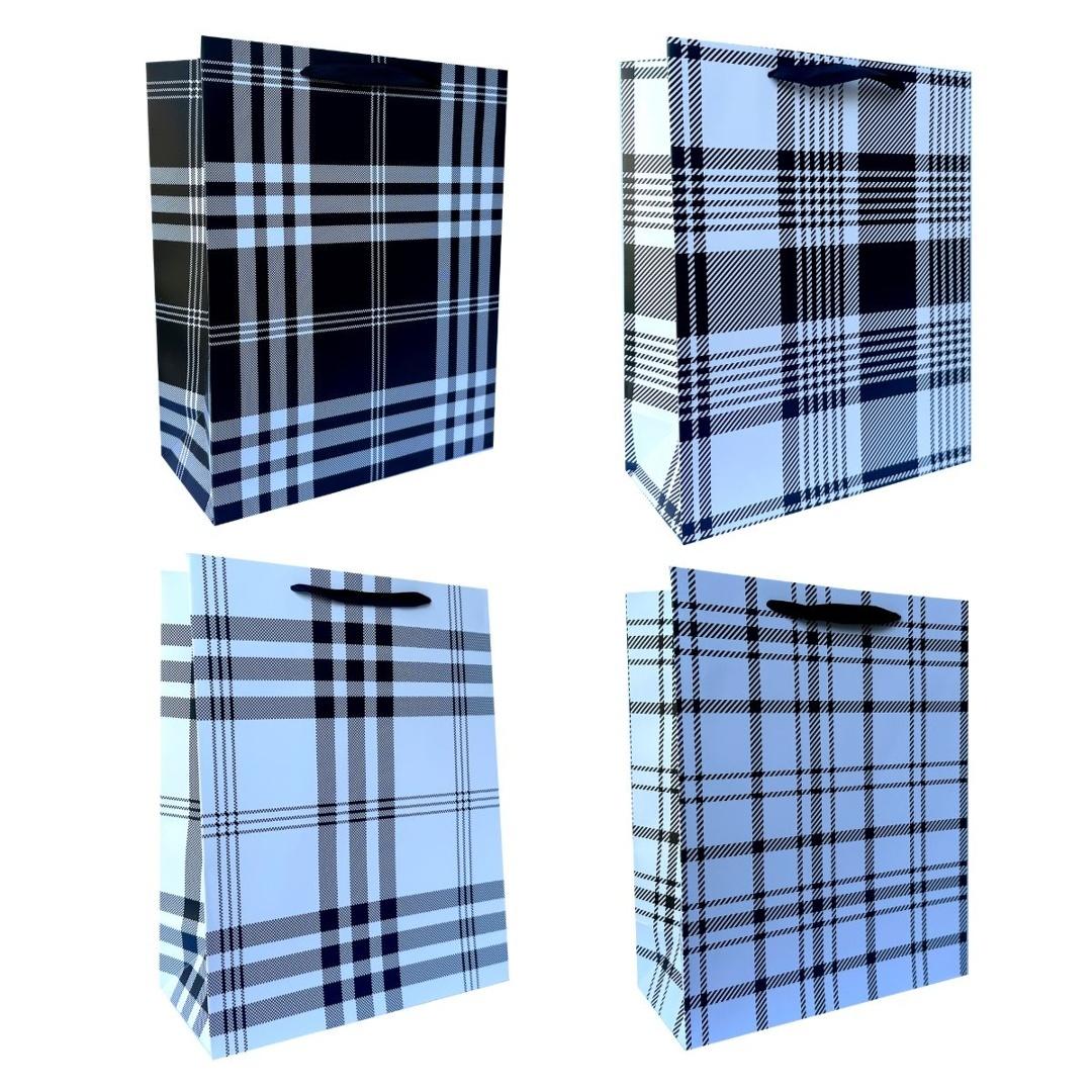 Papierowa torebka prezentowa w czarno-białe wzory kraty wykonana z grubszego papieru o gramaturze 210 g, co zapewnia jej większą trwałość i odporność na obciążenie. Wyposażona w grubszy, kolorowy sznurek, który zapewnia wygodny uchwyt i estetyczne wykończenie. To praktyczne opakowanie, które podkreśla wartość wręczanego prezentu.