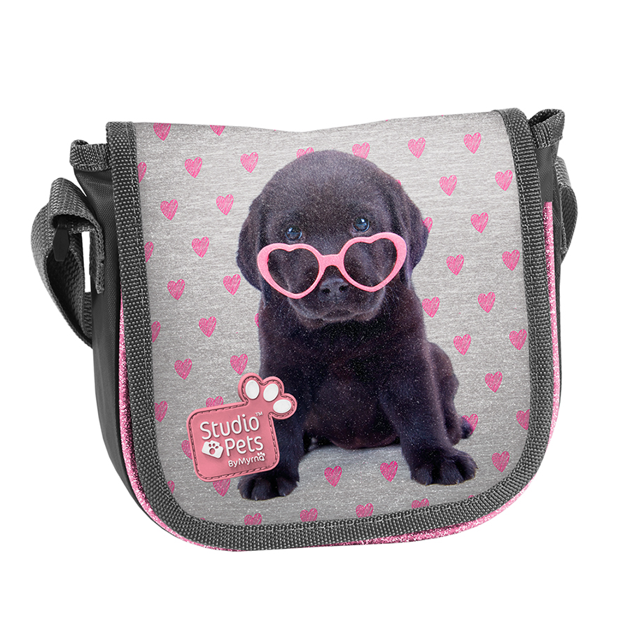 Torebka Studio Pets szara w różowe serduszka. Torebka na ramię posiada regulowany pasek, zapinana jest na rzep. Waga: 80 g Rozmiar: 17x15x4