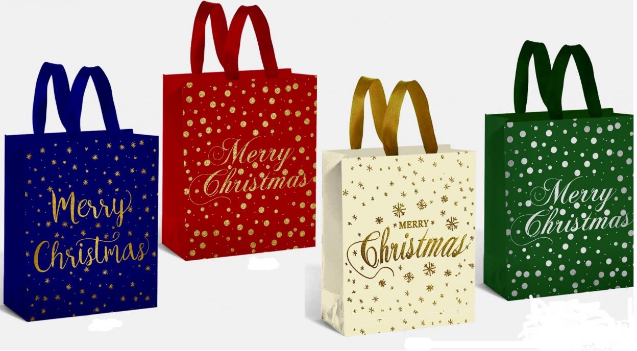 Torebka świąteczna KR 2648 M o wymiarach 26*32*12.5 cm z brokatem. Mix wzorów, towar wysyłany losowo.