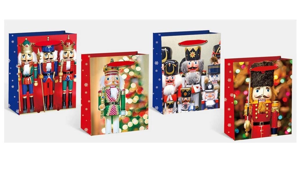 Torebka świąteczna KR 2834 M o wymiarach 26*32*12.5 cm z brokatem. Mix wzorów, towar wysyłany losowo.