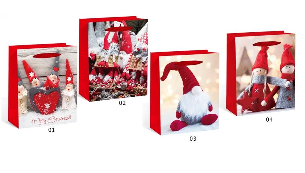 Torebka świąteczna KR 2881 M o wymiarach 26*32*12.5 cm z brokatem. Mix wzorów, towar wysyłany losowo.