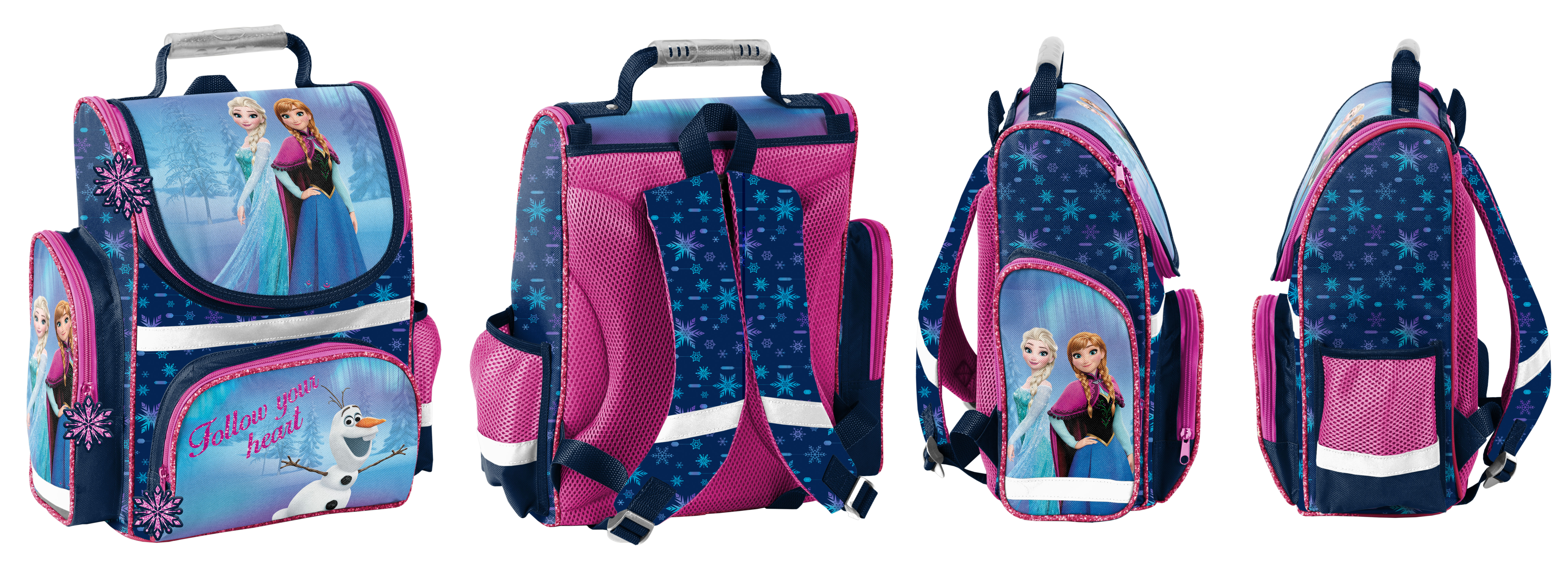 Tornister szkolny. Jedna obszerna komora z wewnętrzynym przedziałem. Na przodzie zapinana kieszeń. Dwie kieszenie po bokach: jedna z siatki, druga zapinana na zamek. Ergonomicznie ukształtowane, sztywne plecy. Wygodnie wyprofilowane szelki.