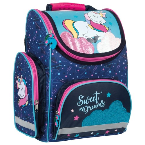 Funkcjonalny, lekki tornister szkolny. Pokrywa tornistra zamykana na zamek, wewnątrz etykieta na dane adresowe. Ergonomiczny tył, miękkie wyściełane szelki, trzy kieszenie zewnętrzne. Dno wykonane z wodoodpornego tworzywa zabezpieczającego przed zabrudzeniem, zamakaniem. Ze wszystkich 4 stron tornistra - taśmy odblaskowe.