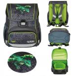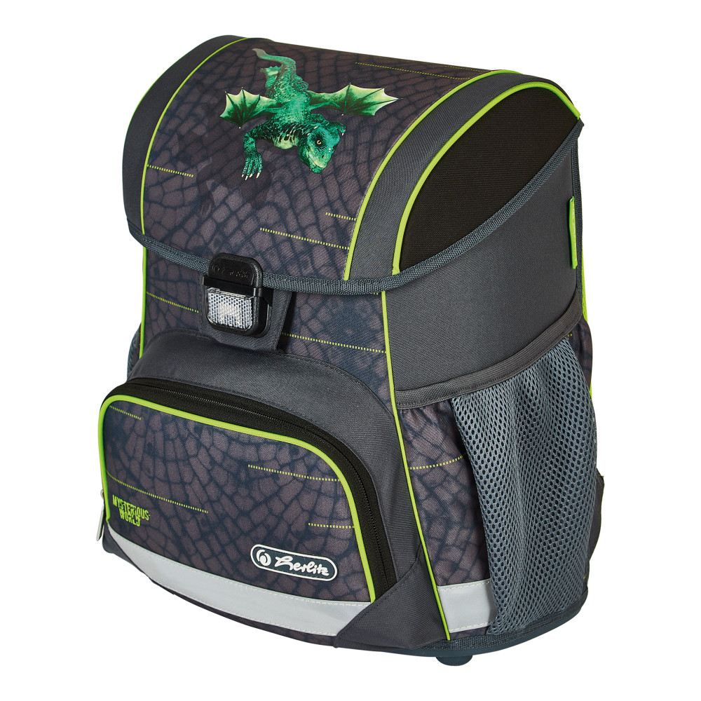 Ergonomicznie ukształtowane i wykonane z przepuszczającego powietrze plecy tornistra, miękko wyściełane szelki, łatwe zapinanie za pomocą klamry ze światełkiem odblaskowym, dwie otwarte boczne kieszenie ze ściągaczem, przednia kieszeń zapinana na zamek, wewnętrzna przegroda organizująca przestrzeń tornistra, materiał łatwy do czyszczenia, plastikowa kieszonka z planem lekcji na wewnętrznej stronie górnej klapy, stabilna plastikowa podstawa, materiał odblaskowy na przedniej i bocznych kieszeniach oraz na szelkach.
