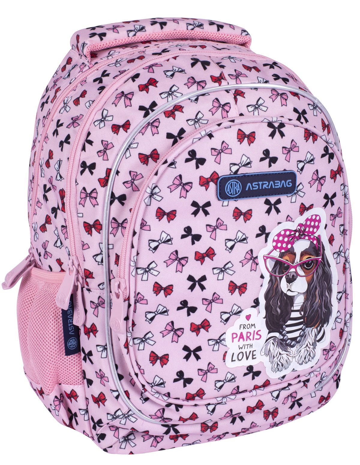 Określenie francuski piesek nabrało właśnie nowego znaczenia. Trzykomorowy plecak Astrabag z uroczym motywem graficznym przedstawiającym modną paryską spanielkę skradnie serce każdej dziewczynki kochającej pieski i róż. Plecak szkolny cechuje się kompaktowymi wymiarami oraz niewielką wagą. Plecak szkolny Astrabag posiada trzy funkcjonalne komory wyposażone w praktyczną kieszonkę oraz organizer na drobiazgi. Zastosowano w nim najnowszą technologię Ergo Back minimalizującą naciski na barki i kręgosłup oraz zapewniającą poczucie komfortu dziecka. Dzięki niej ciężar na plecach rozkłada się równomiernie bez uciskania ramion.