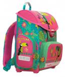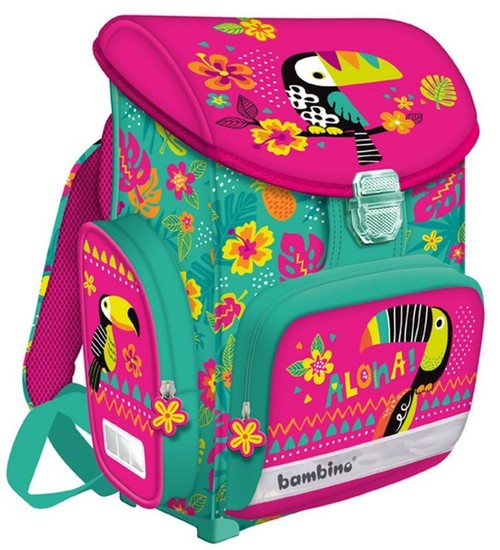 Aplikacja na tornistrze z uroczym tukanem Materiał wodoodporny i wytrzymały Posiada 1 dużą komorę z praktyczną przegrodą Na froncie znajduje się duża kieszeń która bez problemu zmieści piórnik lub śniadaniówkę Po bokach tornister posiada dwie kieszenie na butelkę wody lub bidon Klapa na zatrzask Plecy tornistra usztywnione, ergonomiczne, pokryte oddychającym materiałem Wyprofilowane szelki Elementy odblaskowe