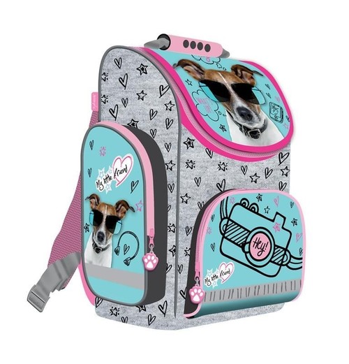 Funkcjonalność: 1 komora główna 2 przegrody wewnętrzne 1 kieszeń przednia 1 zapinana na zamek kieszeń boczna 1 elastyczna siatkowa kieszeń boczna Komfort i bezpieczeństwo: system Venti Stream profilowane usztywnione plecy miękkie szelki nieprzemakalny materiał wzmocniony i nieprzemakalny spód wyjmowane usztywnienie miejsce na podpisanie tornistra regulacja długości szelek liczne elementy odblaskowe wygodne otwieranie i zamykanie gumowa rączka Wymiary: wysokość: 35,5 cm szerokość: 27,5 cm głębokość: 16 cm 14” Waga: 1010 g