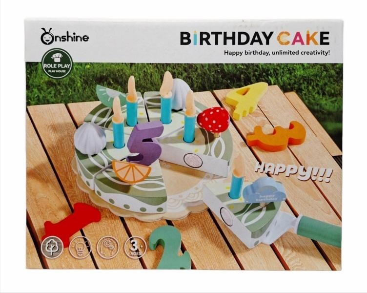 Drewniany tort urodzinowy do krojenia z ozdobami i świeczkami. Zapakowany w kartonowe pudełko. Zabawka przeznaczona dla dzieci od lat 3. Podane wymiary są wymiarami opakowania.