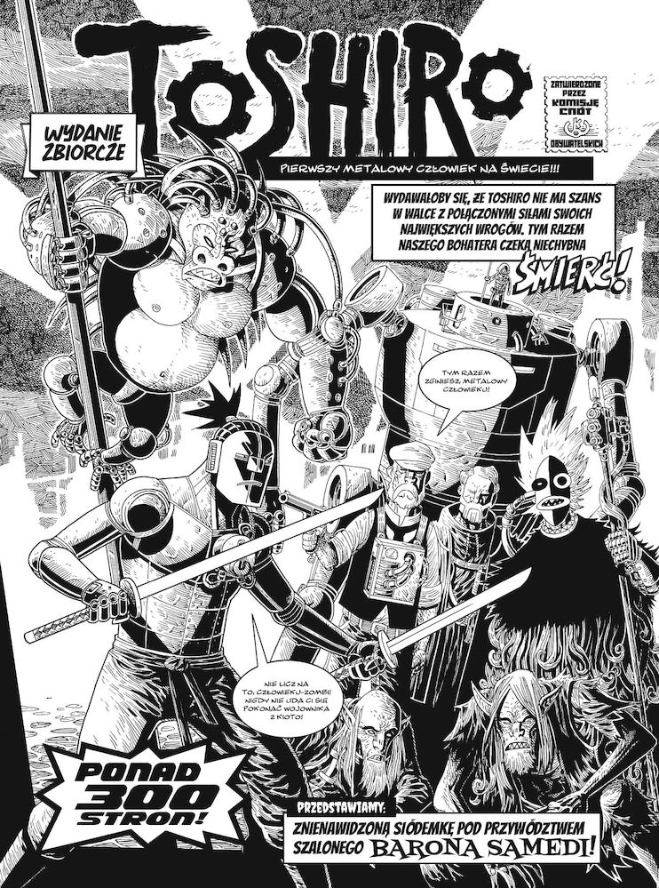 Toshiro - pierwszy metalowy człowiek na świecie, mechaniczny samuraj, który z mieczem w dłoni, ale też wykorzystując najnowsze zdobycze techniki XIX wieku, broni ludzkości przed niezwykłymi zagrożeniami, od Japonii, przez Europę, aż do Stanów Zjednoczonych. Mieszanka steampunku, westernu, horroru i opowieści samurajskich. W jednym tomie zostały zebrane wszystkie wydane dotychczas przygody Toshiro: poczynając od pierwszego pojawienia się metalowego wojownika z Kioto w „Produkcie” nr 23 z roku 2004, poprzez publikacje w zinach „TFUR” i „Pirat”, występy w magazynie „SMASH!”, antologii „KKK#25” i albumie „Josephine: Tchnienie Czarnego Lądu” z wydawnictwa Mandragora, aż po „Kieszonkową Apokalipsę” - album wydany wcześniej przez Dark Horse i Kulturę Gniewu, tym razem z oryginalnym tekstem oraz zupełnie nowymi planszami.