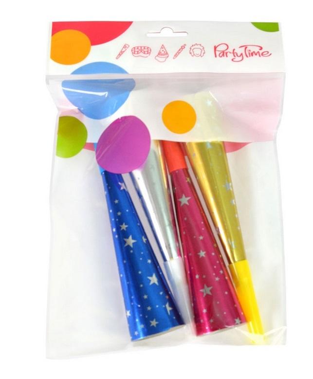 Metaliczne imprezowe trąbki w gwiazdki. Papierowe tuby zakończone plastikowym ustnikiem. Zabawny gadżet na każdą imprezę, do uczczenia solenizanta lub witania Nowego Roku. Trąbki o długości 20 cm. W opakowaniu znajdują się 4 sztuki.