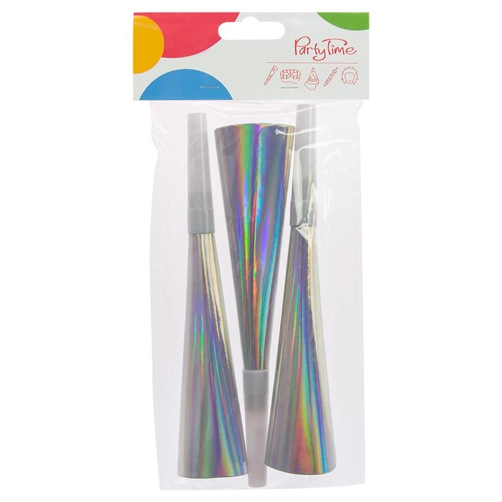 Imprezowe trąbki, tuby papierowe wykonane z mieniącego się, opalizującego materiału zakończone plastikowym ustnikiem. Zabawny gadżet na każdą imprezę, do uczczenia solenizanta lub powitania nowego roku. Trąbki o długości 19 cm. W opakowaniu znajdują się 3 sztuki.