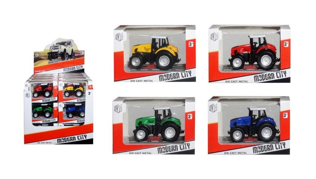 Plastikowo-metalowy traktor. Zabawka na napęd cierny. Produkt dla dzieci od 3 lat. Podane wymiary są wymiarami opakowania. Zabawka zapakowana w kartonowe opakowanie z przezroczystym okienkiem.